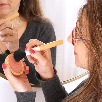 - outil : appliquez le fard à joues avec un pinceau blush (idéalement biseauté pour suivre la forme de la joue).