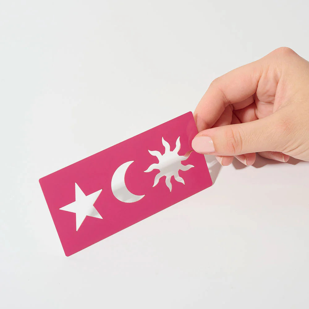Connectez-vous à l'énergie des astres et laissez votre créativité s'exprimer avec le Pochoir Cosmique. Que ce soit pour un festival mémorable, un anniversaire pétillant ou une soirée entre amis, ce pochoir regroupe les symboles célestes les plus iconiques : l'étoile, la lune et le soleil. Conçu pour réaliser des tatouages éphémères d'une précision chirurgicale, il transforme chaque application en une véritable œuvre d'art cutanée. Sa conception souple épouse parfaitement les courbes de votre visage ou de votre corps pour un résultat net, sans bavure, et surtout, infiniment scintillant.