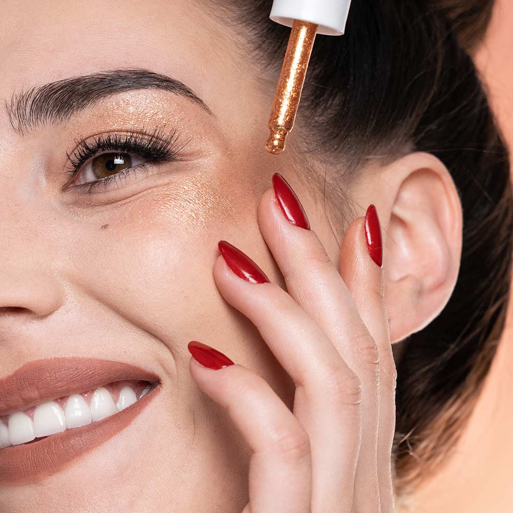 L'application est incroyablement facile. Déposez-en quelques gouttes sur les zones qui accrochent naturellement la lumière : le haut des pommettes, l'arête du nez, l'arcade sourcilière, le coin interne de l’œil, ou encore le décolleté et les épaules.